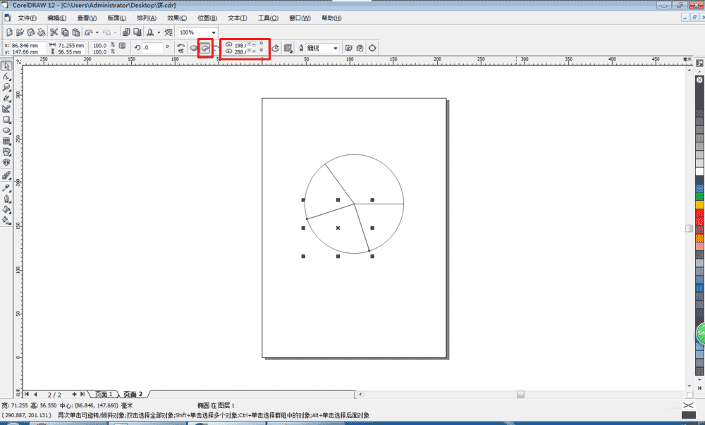 6、单击选择另一个圆。点击属性栏上的饼形,设置起始角度为198,结束角度为288。