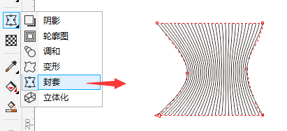 步骤3:使用封套工具创建封套效果,单击“封套工具”,在调和对象上会出现封套边界框,任意拖动节点改变对象形状。
