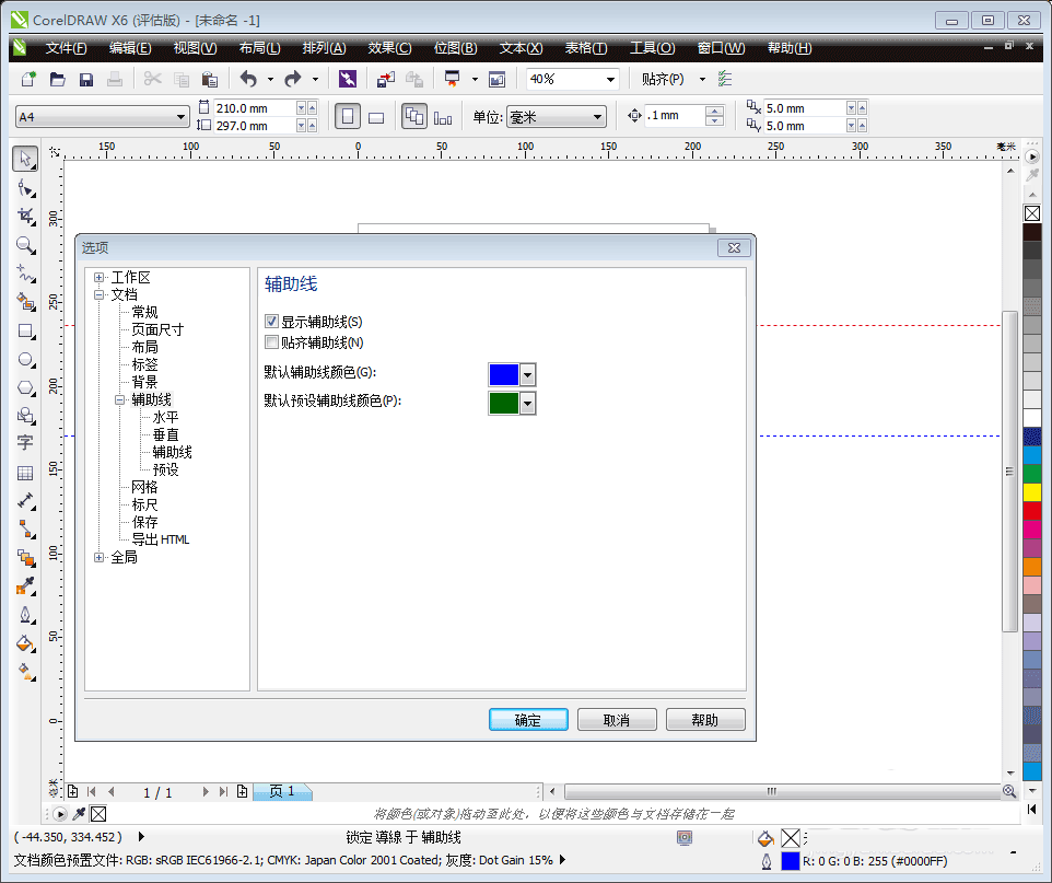 3、在弹出的对话框中,选择左侧中的“辅助线”该选项。那么接下来就可以对辅助线进行基本设置。