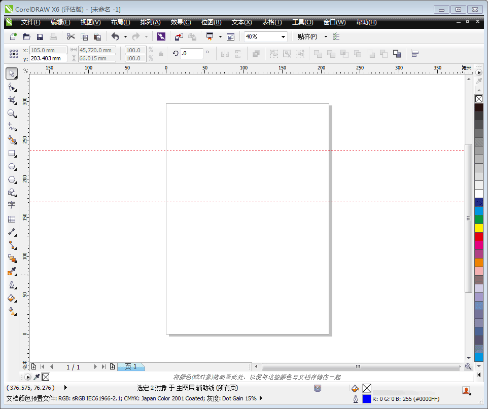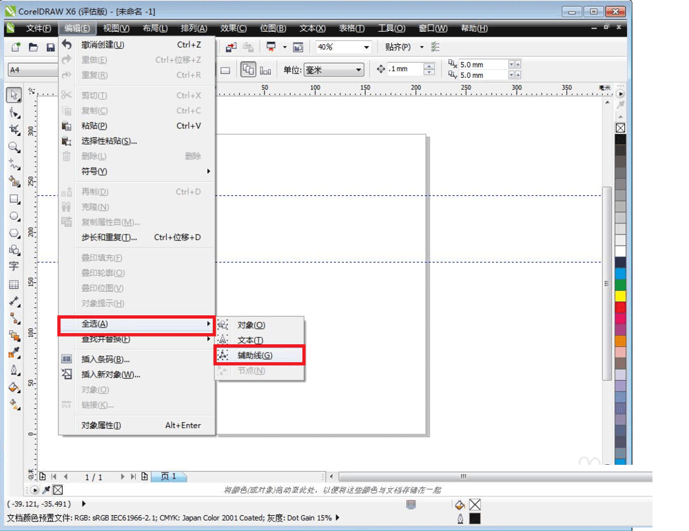 4、辅助线的使用技巧包括旋转,锁定等。首先确定如何选定辅助线。如图1所示有两条蓝线,如需要锁定全部,即点击菜单栏上的“编辑”选项中的“全选”,在下拉菜单中选择“辅助线”点击,那么就会如图3辅助线变为红色。