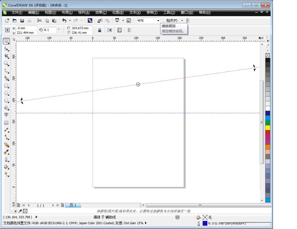 5、选择完辅助线后,将光标再次点击辅助线一下。即会在辅助线上跳出可以旋转的按钮,只需要向右边上移,即点击右侧的光标,拖动即可。