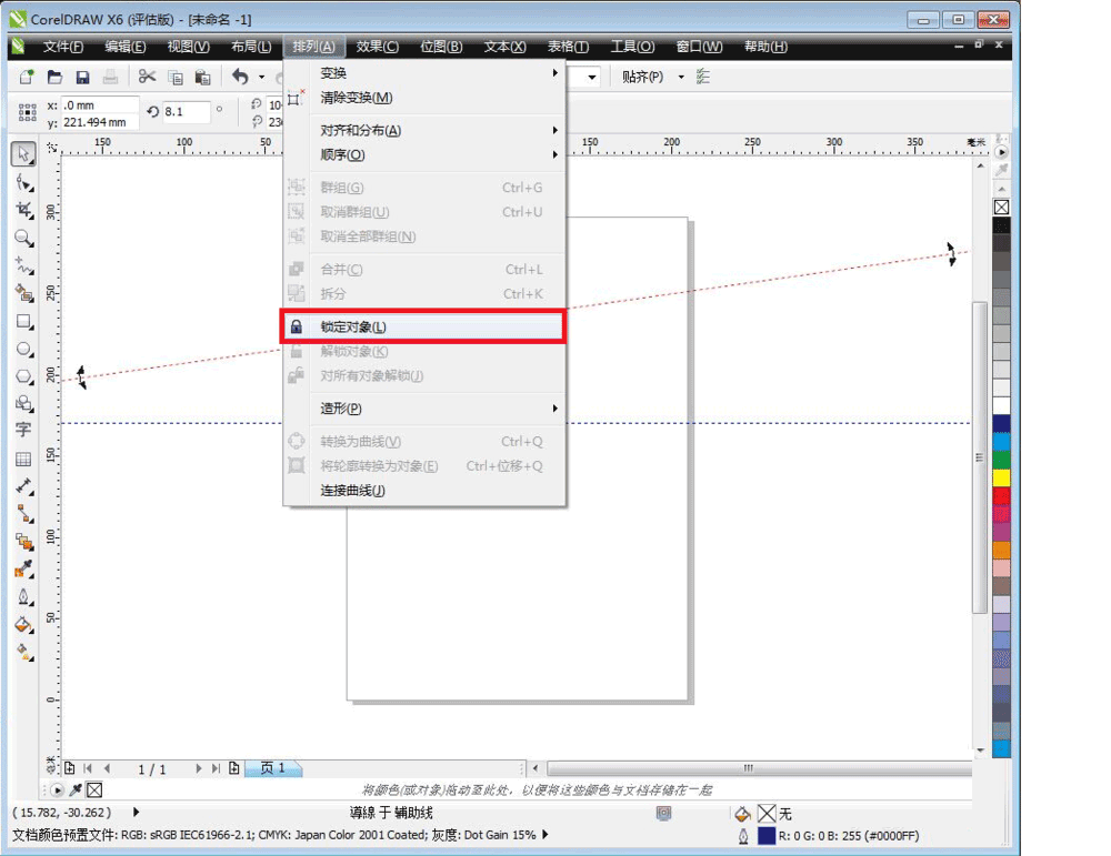 6、调整完毕后,如需要锁定该条线,即点击菜单栏上“排列”按钮,在下拉菜单中选择锁定对象即可,那么该辅助线不能被移动或更改。