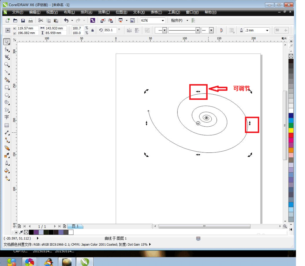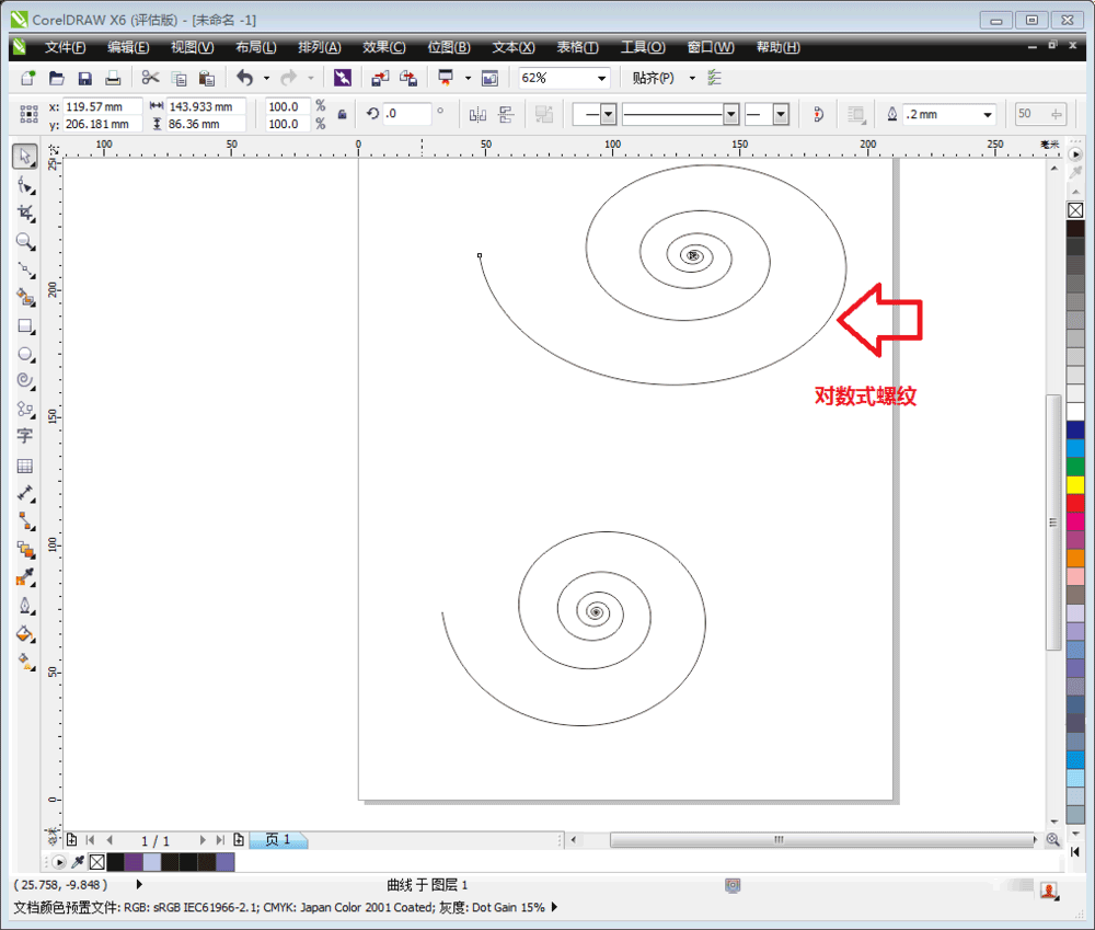 4、在调整大小的按钮旁边有一个“对数螺纹”是从内向外扩大,内圈数量比较密集。