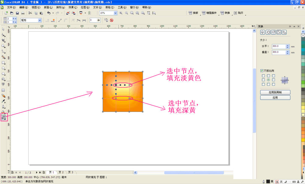 选网状填充工具,方形中间的上面两节点选淡黄色,下面两节点选深黄色