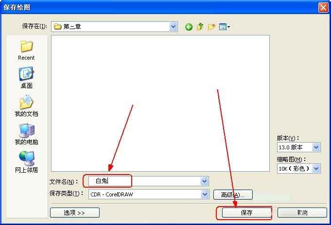 2、选择“文件”→“保存”命令,打开“保存绘图”对话框,在对话框中设置文件名为“白兔”,保存类型为CDR-CorelDRAW,然后单击“保存”按钮即可将该图形文件保存,如图所示。
