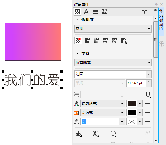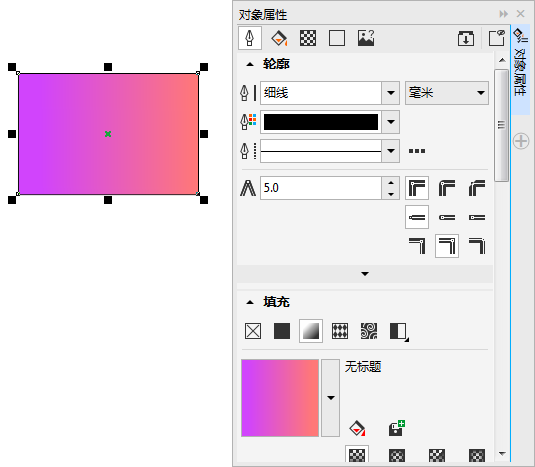 对象属性泊坞窗显示与对象相关的格式选项和属性;使您可以从一个位置修改对象设置。例如,如果您创建矩形,那么对象属性泊坞窗将自动显示轮廓、填充、透明度与拐角格式选项以及矩形的属性。