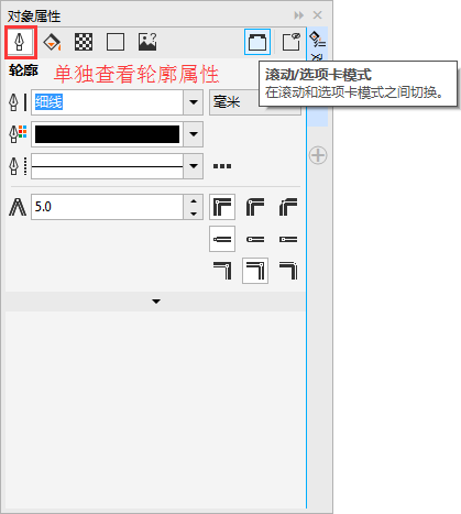 您可以使用对象属性泊坞窗顶部的控件来快速浏览至要修改的属性。此外,还有两种查看模式可用:滚动和选项卡模式显示所有相关对象属性,使您可以滚动到您需要的选项。选项卡模式一次仅显示一组对象属性,同时隐藏其他选项。例如,您可以只查看填充选项,然后单击轮廓按钮只查看轮廓选项。