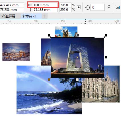 2、然后选择其中一张图片,在属性栏设置好该图片的尺寸按回车,比如设置图片宽为100mm(在锁定比率的状态下,高自动根据宽的变化而变化)。