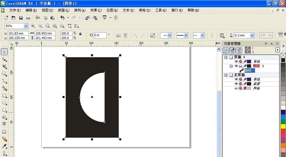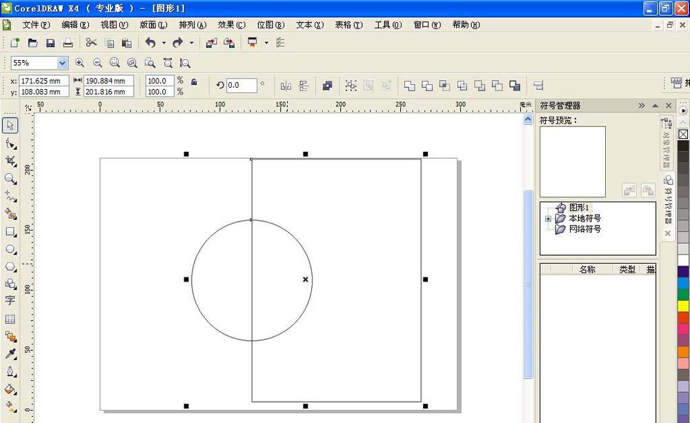 1、新建一个横向的空白文档,选择椭圆工具,按住crl键绘制正圆,然后选择矩形工具,选择挑选工具,将矩形选中,移动到矩形的边缘开始调整到圆形的中心位置。
