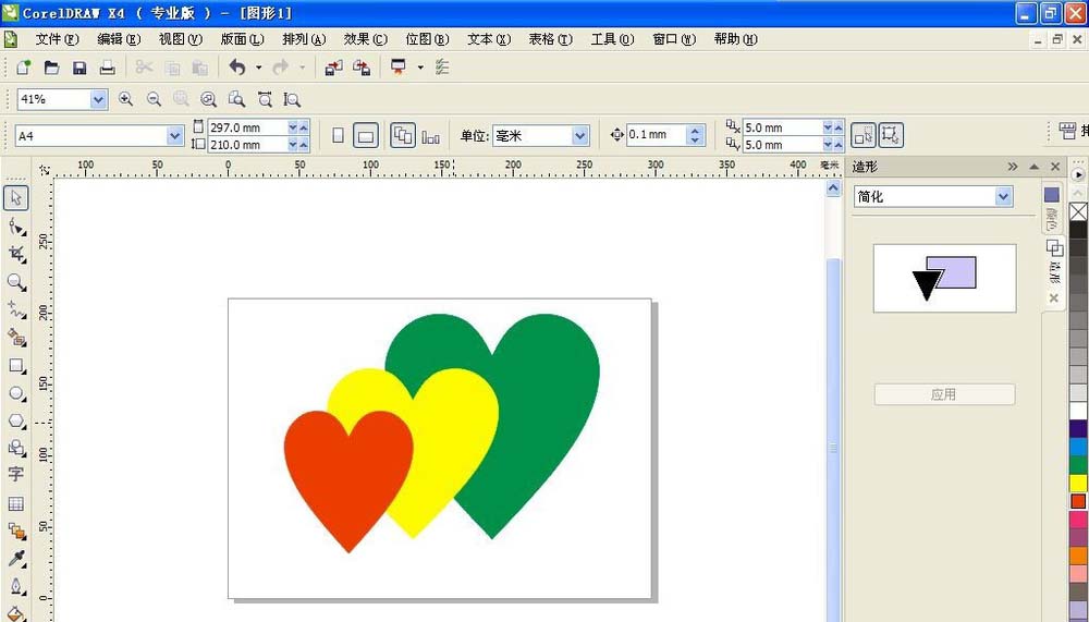 1、按crl+N新街口一个空白文档,选择形状工具,找到桃心的工具。绘制三个桃心,然后每个桃心都填充颜色,包括红色,黄色,绿色。绿色的桃心位于最底层。如图