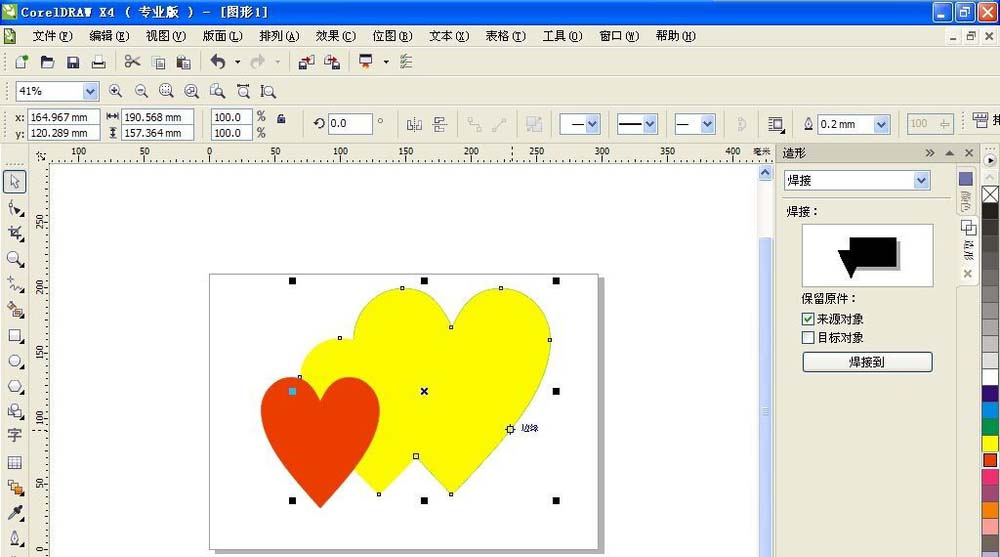2、选择焊接工具,可以先选择绿色的桃心,然后选择排列,造型,焊接,然后点击一种图形,那么另外一种图形也会跟随着变色。如图