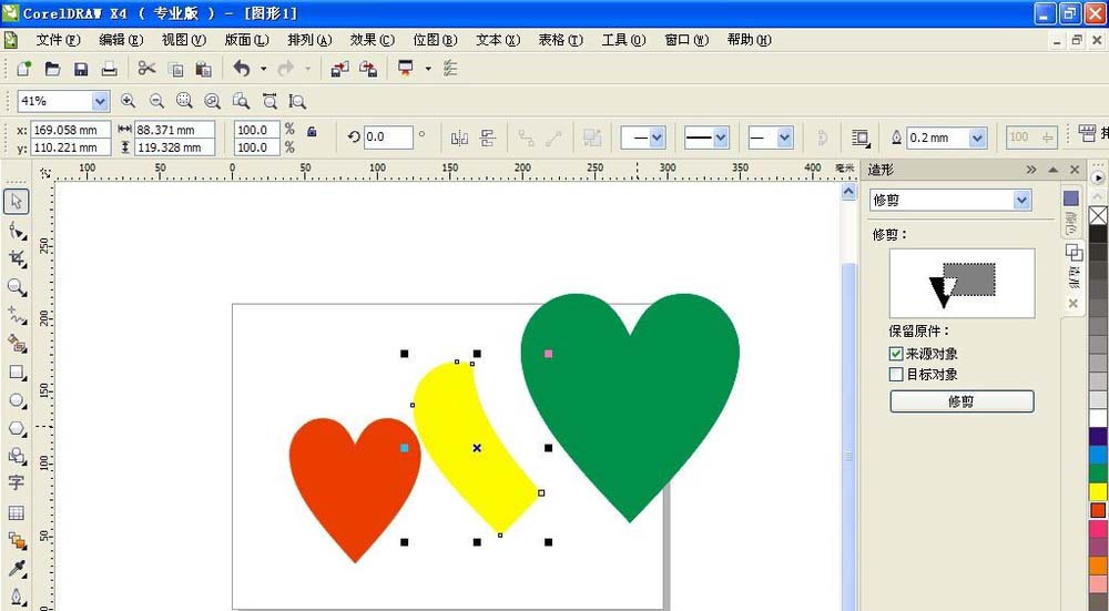 3、选择修剪对象,然后选择排列,造形,修剪命令,选择大桃心对象,然后制定为来源对象,选择修剪工具,然后点击小一点的桃心,这时候就会裁剪出相应的桃心。
