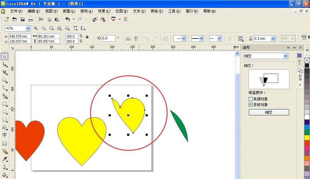 6、选中两个桃心,选择移除后面的对象,那么后面的对象被移除,选择选择工具,可以移动出来图形。如图