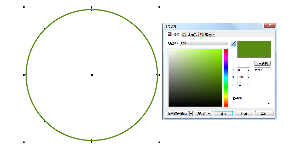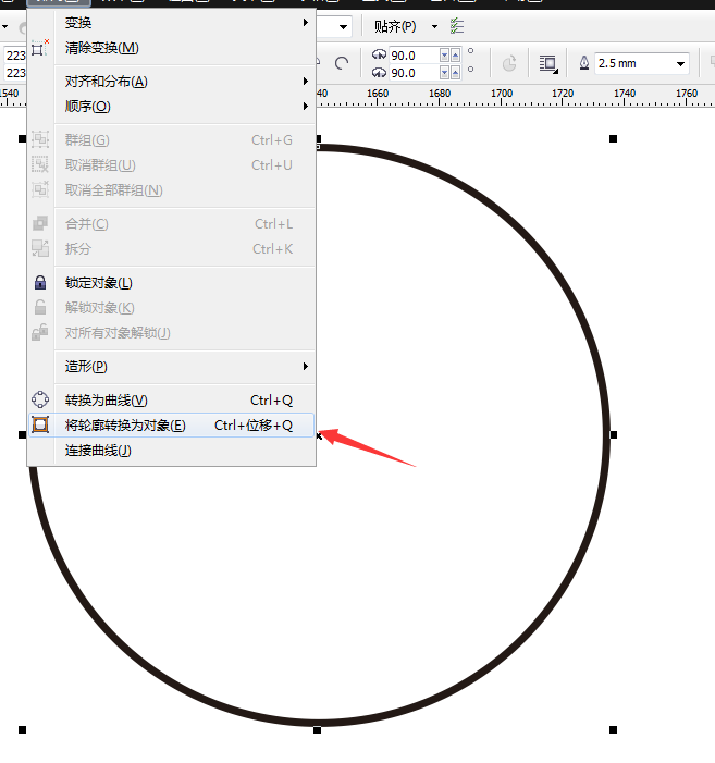 8、绘制一个正圆,把轮廓调粗点,再点击排列里的将轮廓转换为对象,然后填充颜色