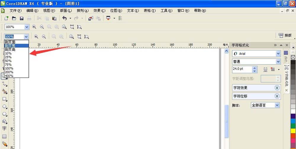 1、新建一个空白文档,按快捷键Crl+N进行新建文档,然后选择缩放工具,设置到页面宽,这时候页面的整体宽度会变大,如图