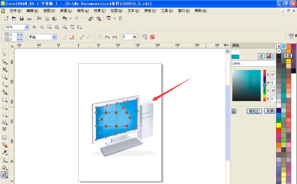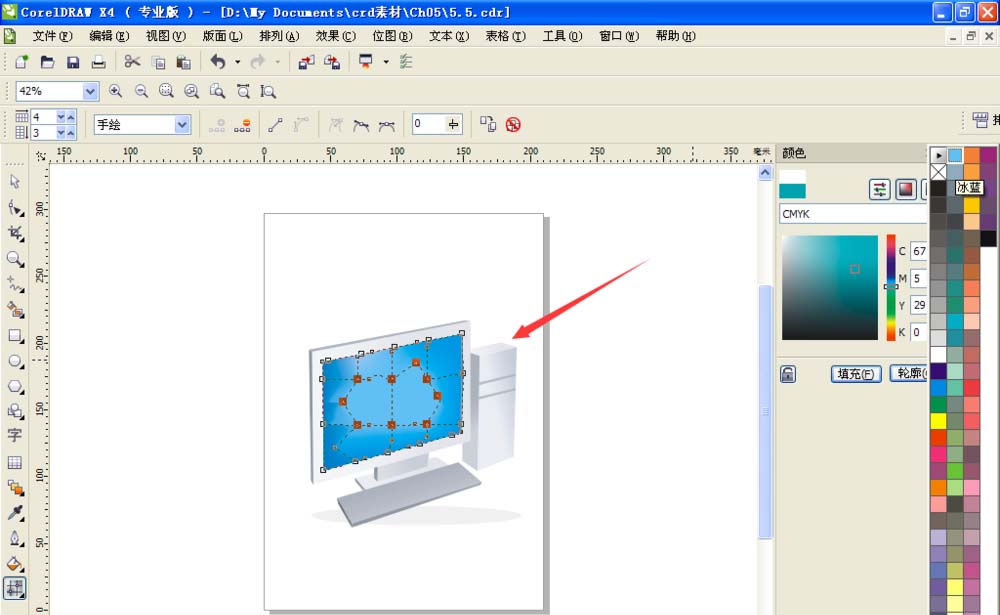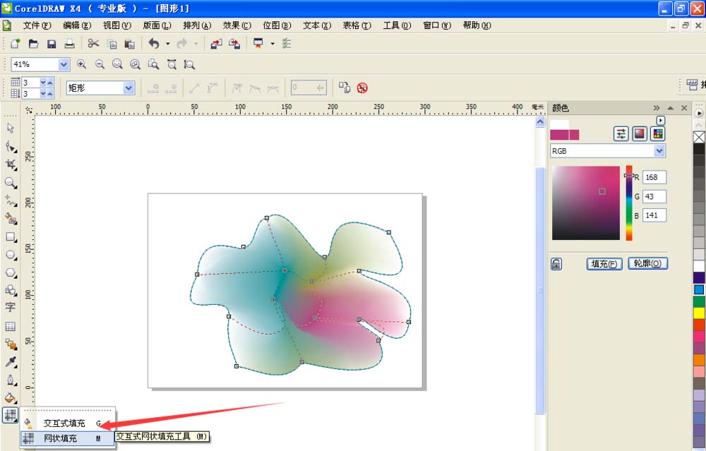 6、也可以自己绘制一个矩形,然后选择选择交互式网状填充工具,对图形进行填充,设置网络大小的行列数值,然后设置选取的范围为手绘,然后进行填充,填充的颜色可以按住shift键选择多个点,然后继续填充颜色。如图