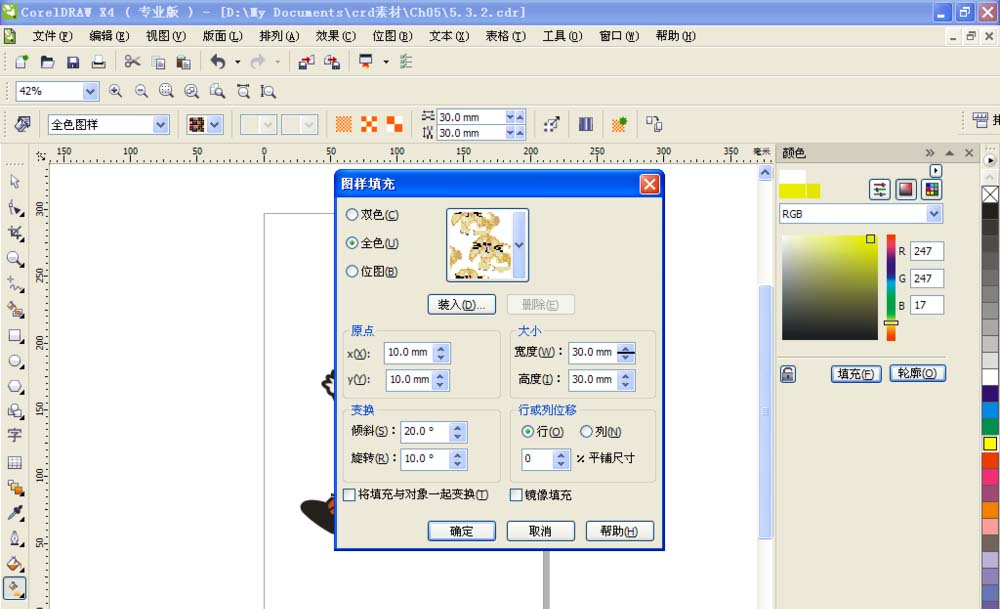 1、新建一个空白文档,可以选择横向,或者是纵向。打开一张图片,然后选择图样填充工具,可以设置双色的,全色的,位图的,各种形状,右边也可以设置前部和后部的颜色,如图