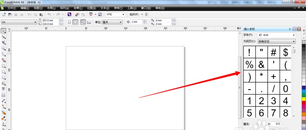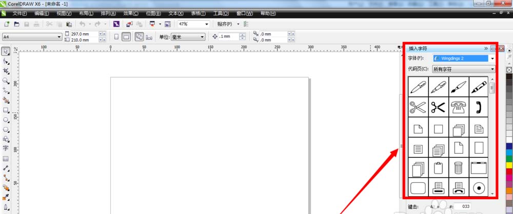 2、接着就可以在cdr软件右边出现的“插入字符”面板上看到很多各种各样的符号字符