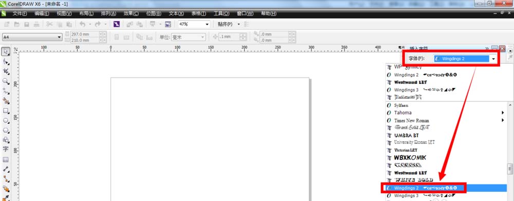 4、假设我们选择了“wingdings2”这种字体,出现了与之对应的符号字符如图所示