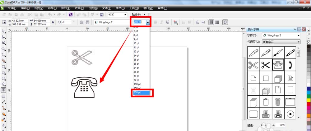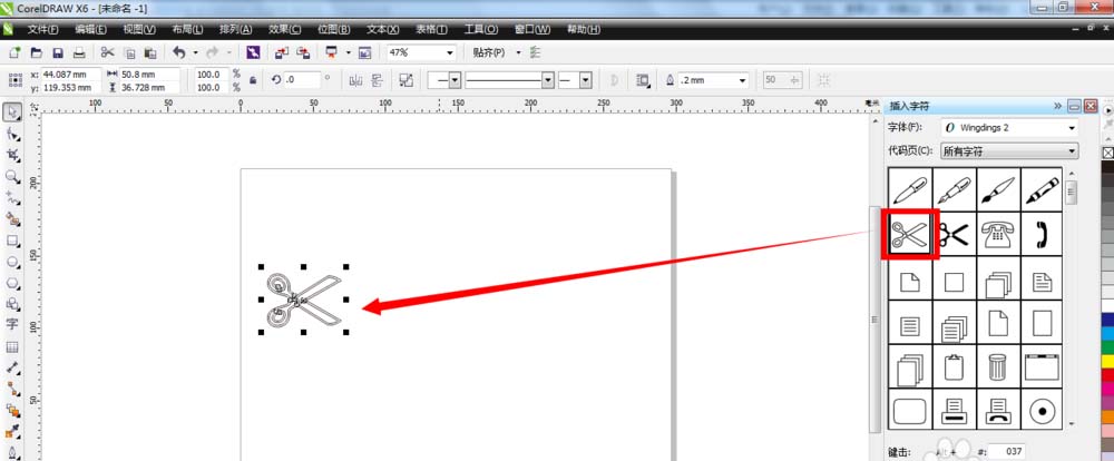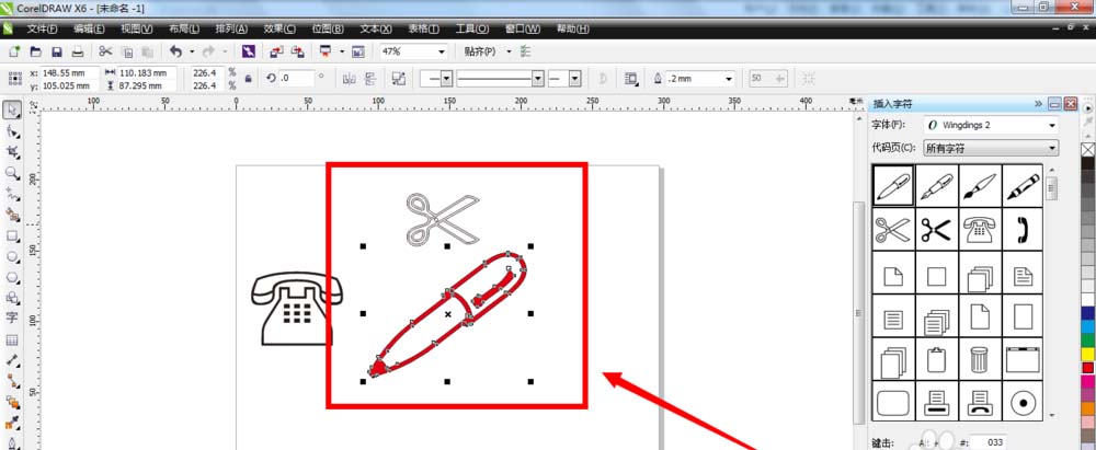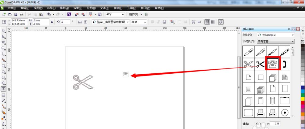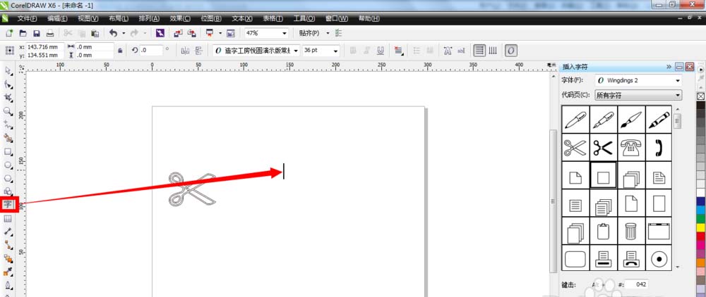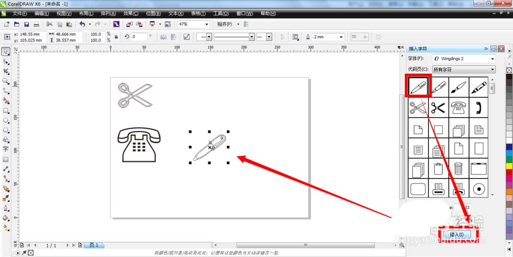 1、使用符号字符面板上的“插入”按钮。单击选中其中一个符号,比如钢笔,再点击下面的“插入”按钮,即可把符号插入到空白的页面上。