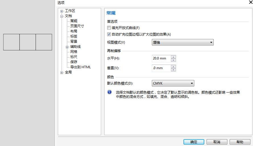 在标准工具栏上单击“选项”按钮,打开“选项”对话框,在“文档”>“常规”下设置再制偏移,水平20mm。确定后选中矩形按组合键Ctrl+D两次再制两个一样的矩形。
