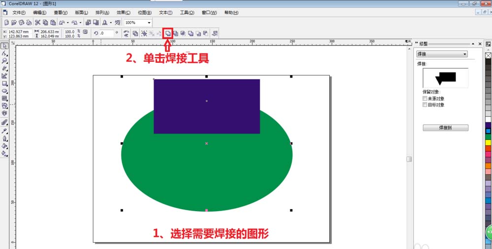 4、如何区分焊接泊坞窗中的来源对象和目标对象。来源对象即我们单击选择的对象,目标对象即我们点焊接到按钮后去点击的对象。
