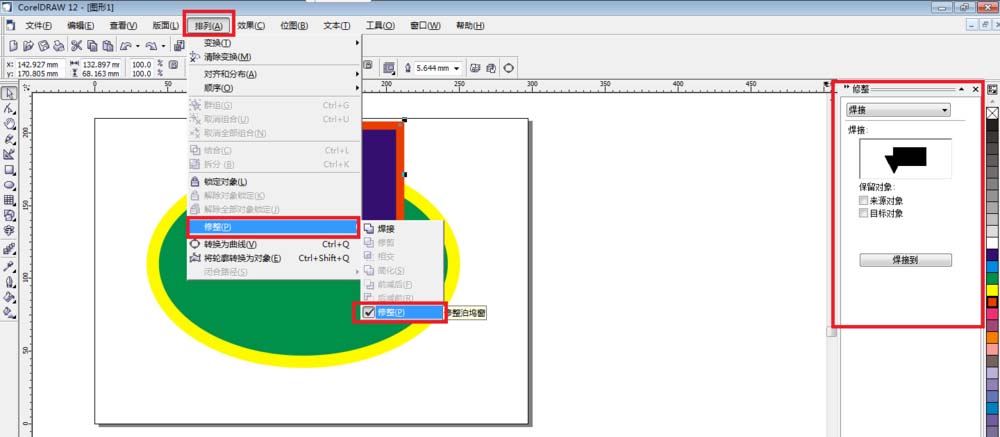 2、我们还可以通过单击菜单栏,"排列\修整\修整工具"进入修整泊坞窗进行焊接。