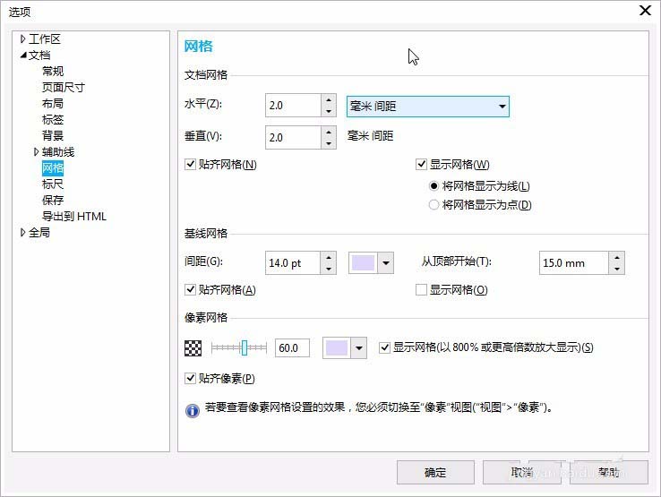 2、视图-->网格-->文档网格;选项-->文档-->网格-->文档网格“水平:2毫米间距,垂直:2毫米间距”