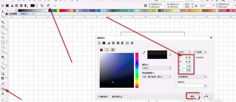 11、填充颜色,选择左边工具栏的交互式填充工具。按属性栏的属性编辑按钮。在CMYK分别输入:85;50;0;0;点击确定。