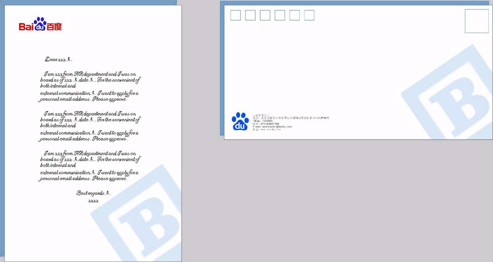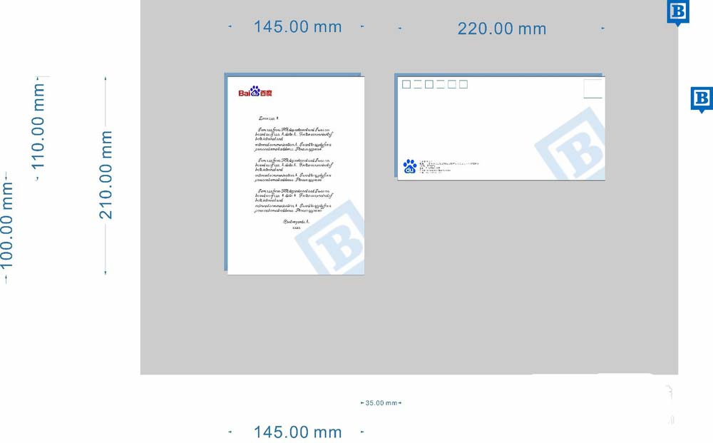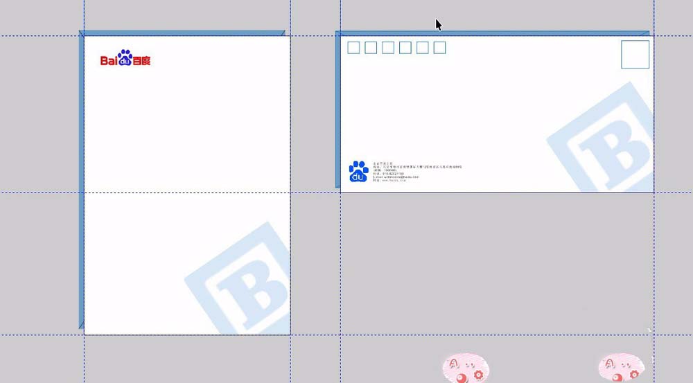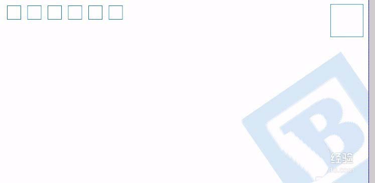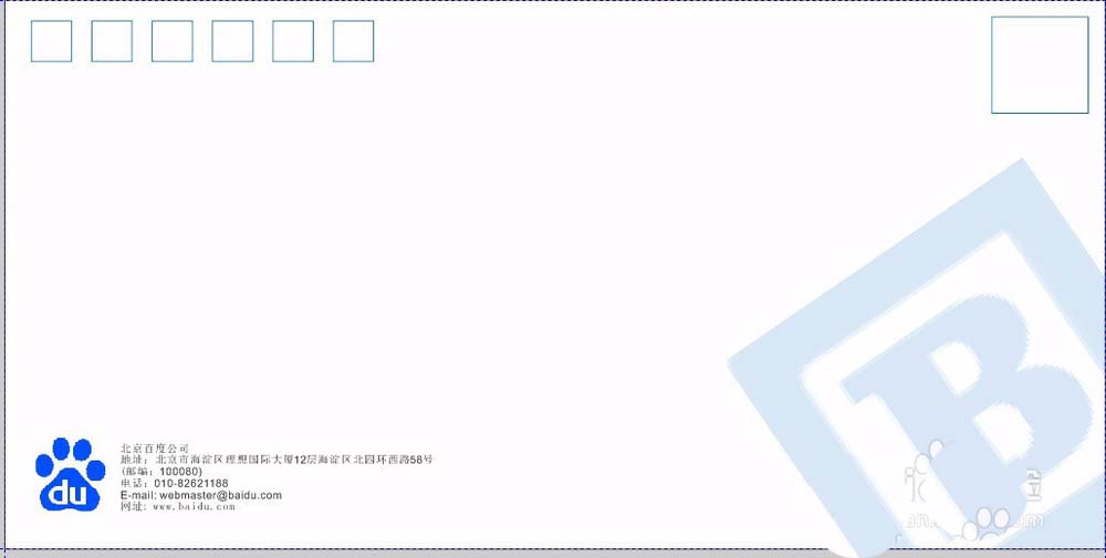 10、再复制一份,按住ctrl键拉大放在右上角。这是贴邮票的地方。导入logo,放在信封左下角。添加一些装饰文字。公司名称,地址,联系电话,和邮政编码等。也是放在左下角。