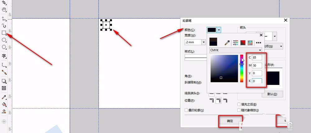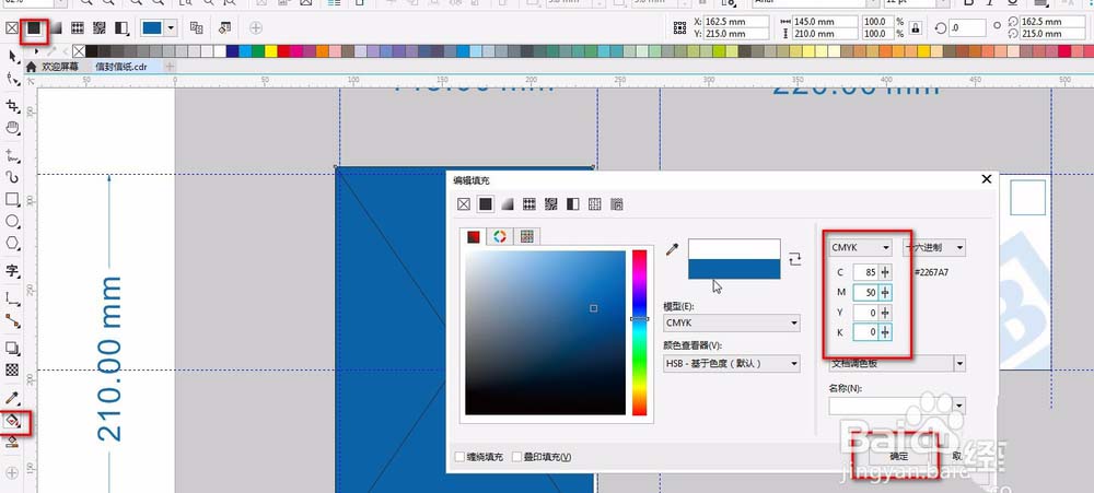 9、导入公司logo,ctrl+i,并调整大小。信封上面的左上角用矩形工具按住ctrl绘制一个正方形框,无颜色,按F12,编辑轮廓,颜色:CMYK:C:85;M:50:Y:0;K:0;单击确定。按住ctrl水平复制一份到旁边,调整好距离。按ctrl+R复制再复制四个。总共六个。