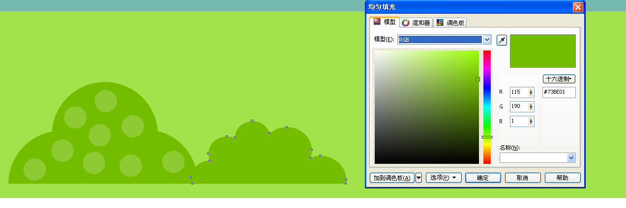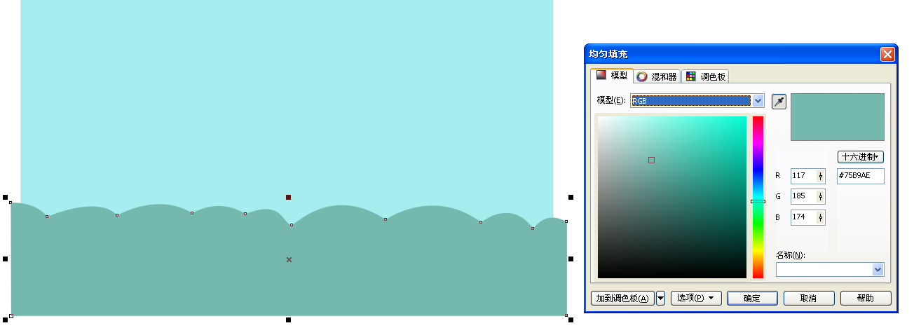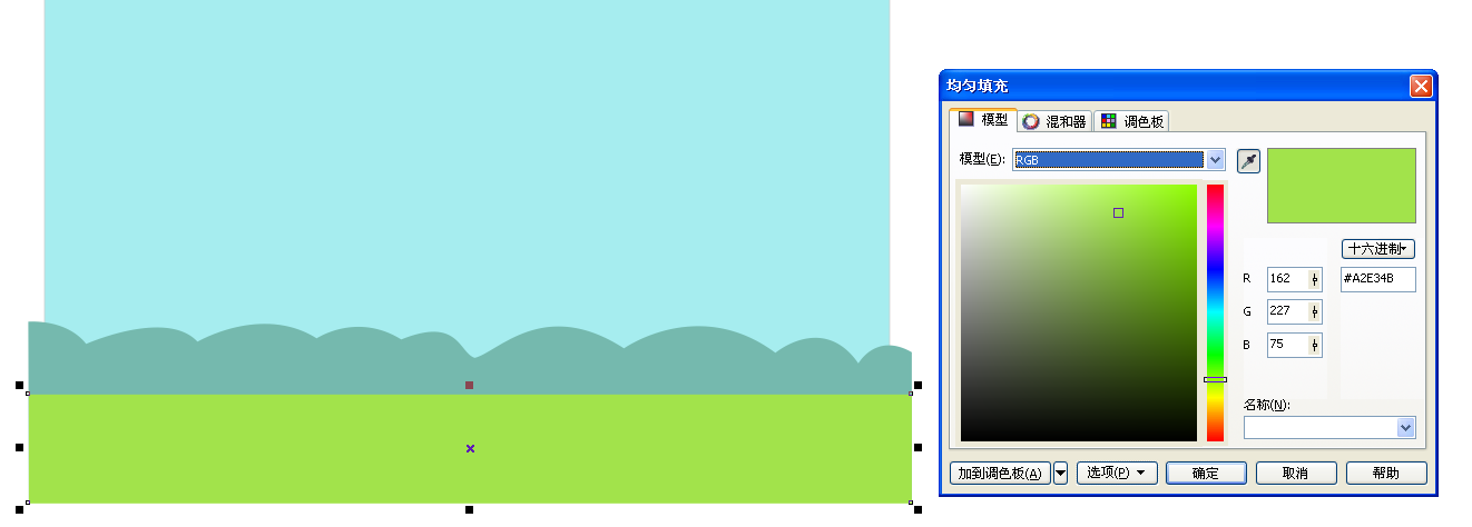 2、选择左边工具栏里的贝赛尔工具绘制一个起伏的山坡,随意画,填充颜色,如图