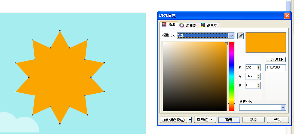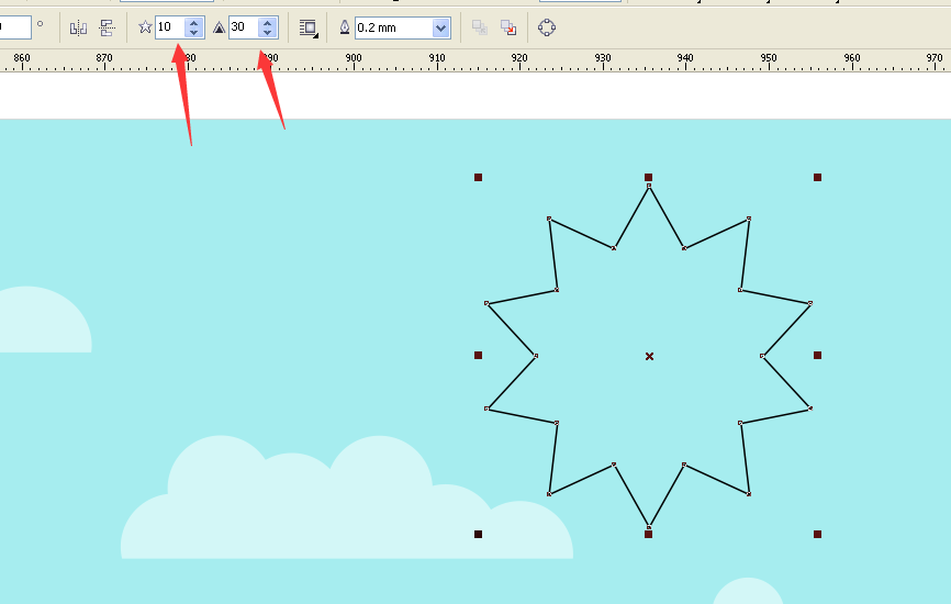19、绘制大阳,选择星形工具,设置参数为边数为10,角度为30,然后填充颜色,用椭圆绘制一个椭圆放到星形中间,如图