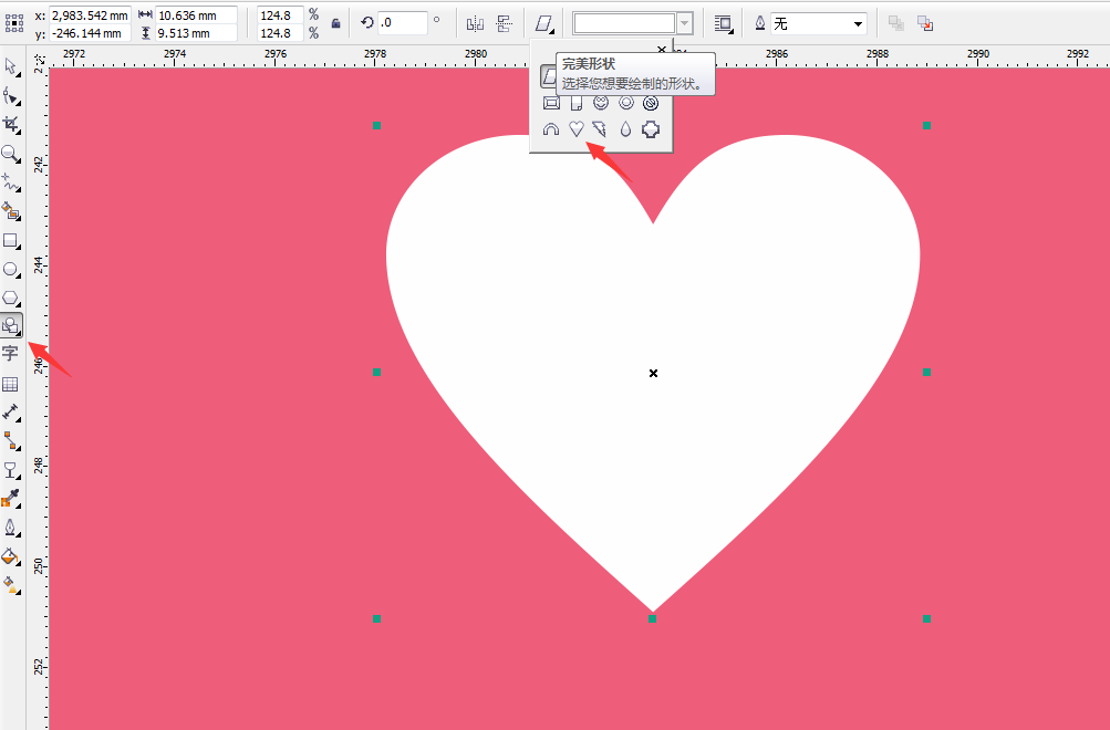 10、找到基本形状里的心形,绘制一个心形,填充白色,去掉轮廓