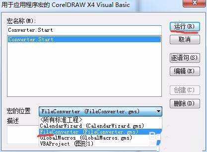 2、在对话框下面的宏的位置中选择FileConverter,然后点击运行,然后会弹出一个对话框。