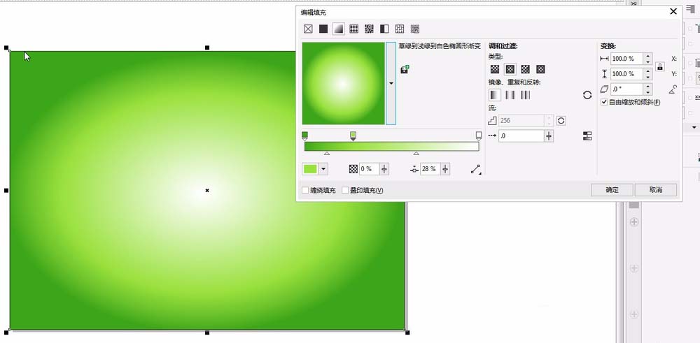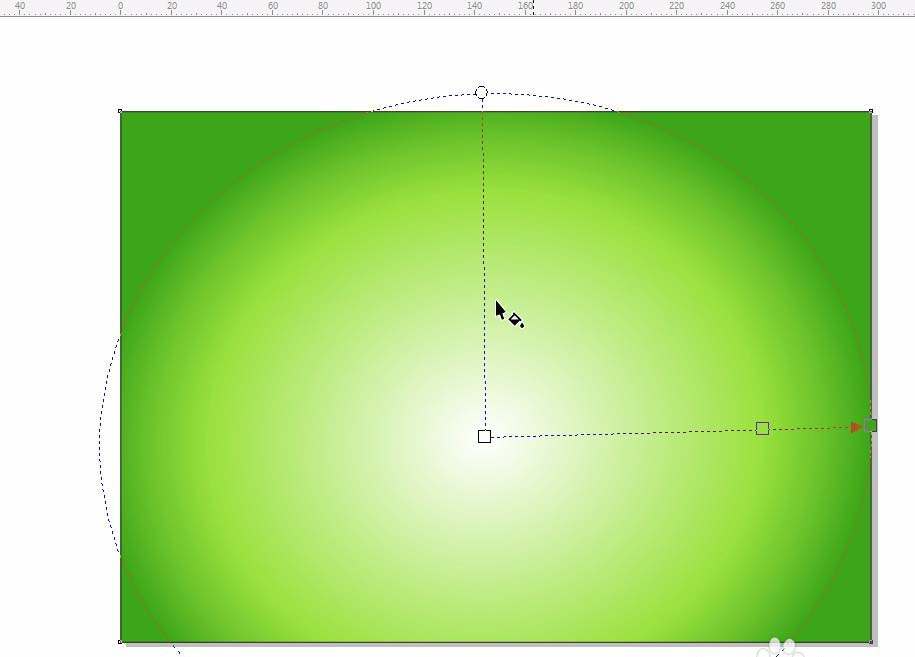 2、双击矩形工具,绘制一个和页面等大的矩形。按F11填充椭圆形渐变,颜色值为①#3DA618②#99E13C③#FFFFFF;按G调整中心点位置。