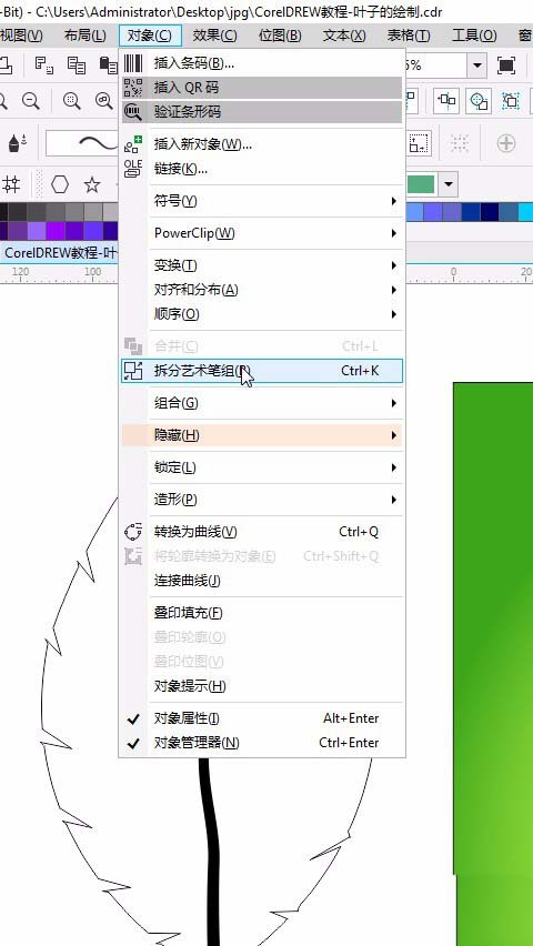 6、选中间的那根,点击对象【拆分艺术笔组】ctrl+k,将中间的路径拖出来删除;点击手绘工具,绘制如图形状。