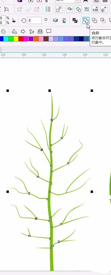 12、将杆取消群组。并框选点击属性栏的合并。按G,调节颜色。绘制好后,放置在页面中间,并选择角度。添加阴影。点击阴影工具。