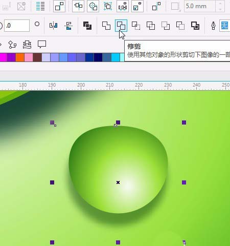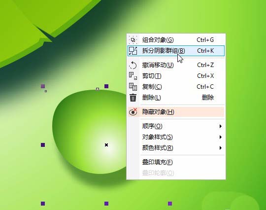 14、点击阴影工具,绘制一个阴影,设置属性栏的不透明度为50,羽化15,颜色#064504,如图。点击右键擦分阴影化群组。选中豆豆和阴影。在属性栏选择修剪。修剪好后,添加透明度。
