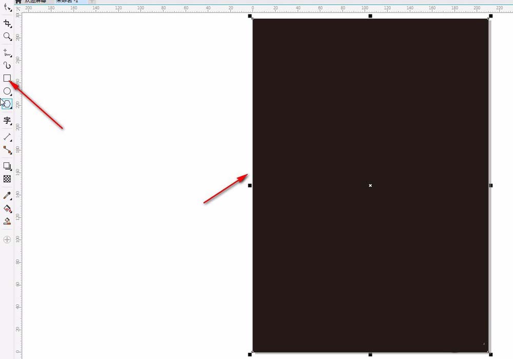 2、选择矩形工具,在页面中绘制一个矩形,并填充黑色。如图所示。在这个矩形的基础上用选择工具按住shift键,在矩形四个角的其中一角上点击往里拖动缩小,并点右键。复制一个矩形。填充白色。