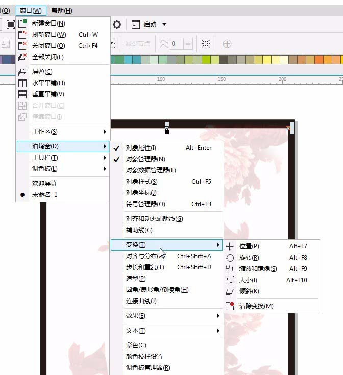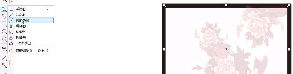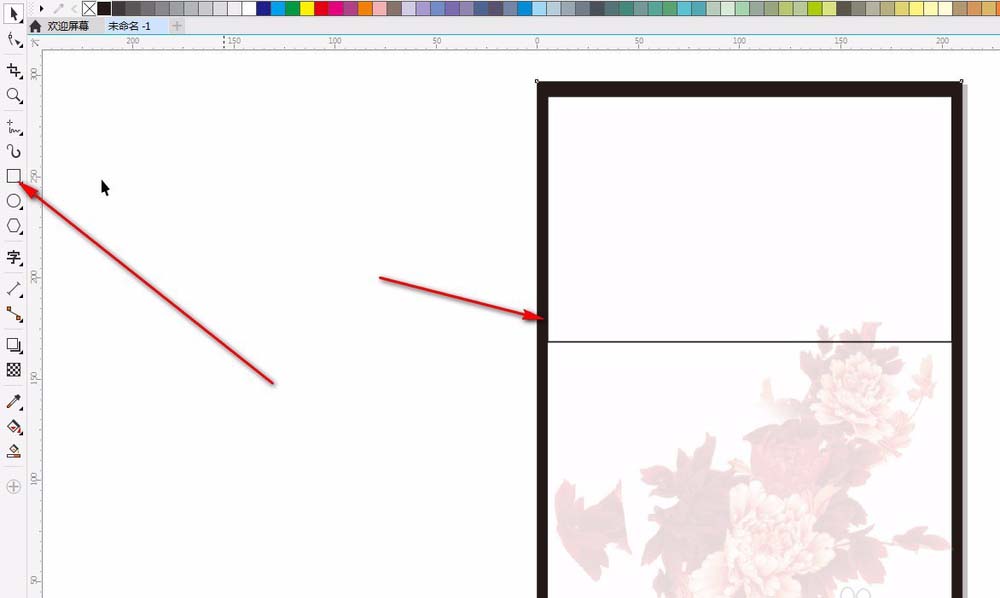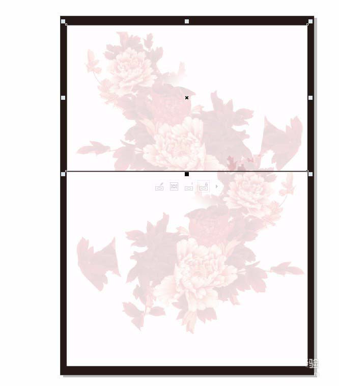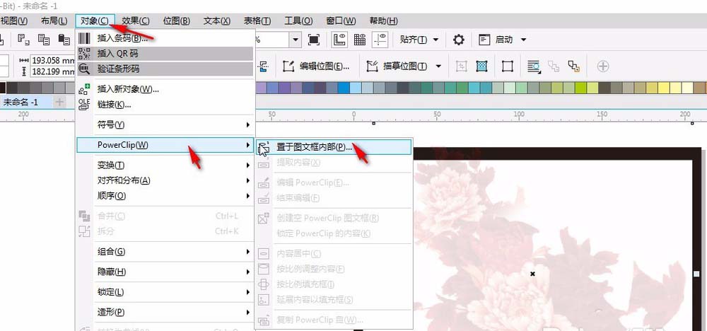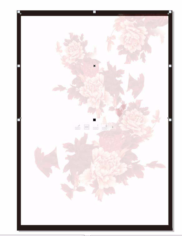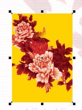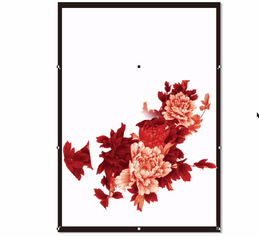 6、选择花的图形拖动鼠标右击复制一个。拖动到矩形上方。调整好,选择牡丹,点击菜单栏 对象-->Powerclip-->置于图文框内部;将图案放在矩形框内。设置轮廓色为无。如图。