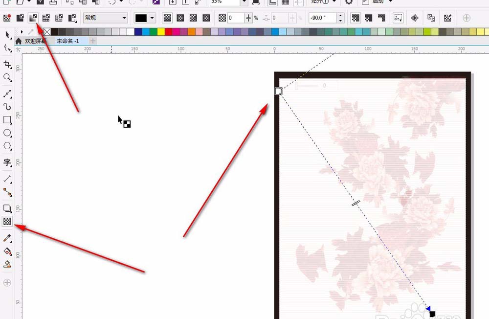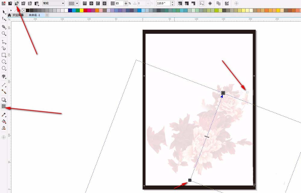 4、选择画面中的花型图像,点击透明度工具,选择渐变透明度。调整透明度直到想要的效果如图。