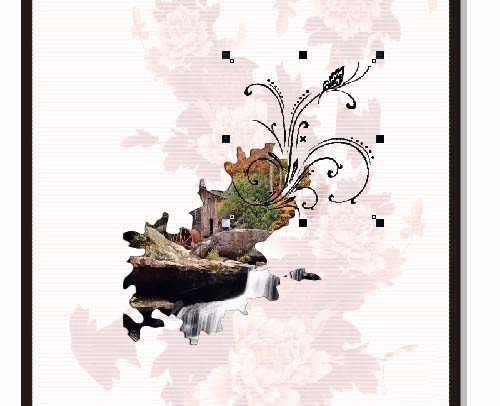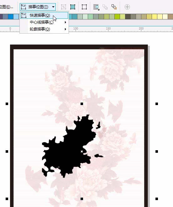 13、导入一张素材 文件-->导入;点击属性栏快速描摹。如图。导入一张风景图。做12的步骤,置入图框中,并调整好位置。调整好的效果如图。