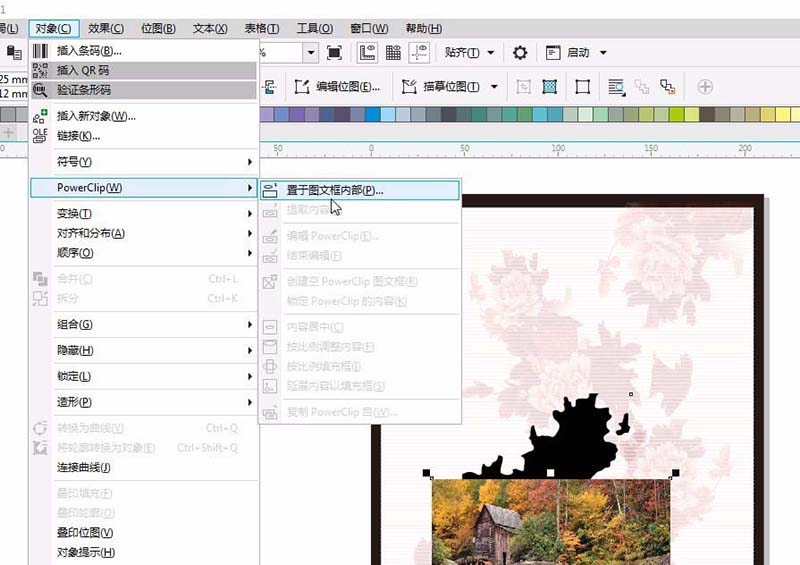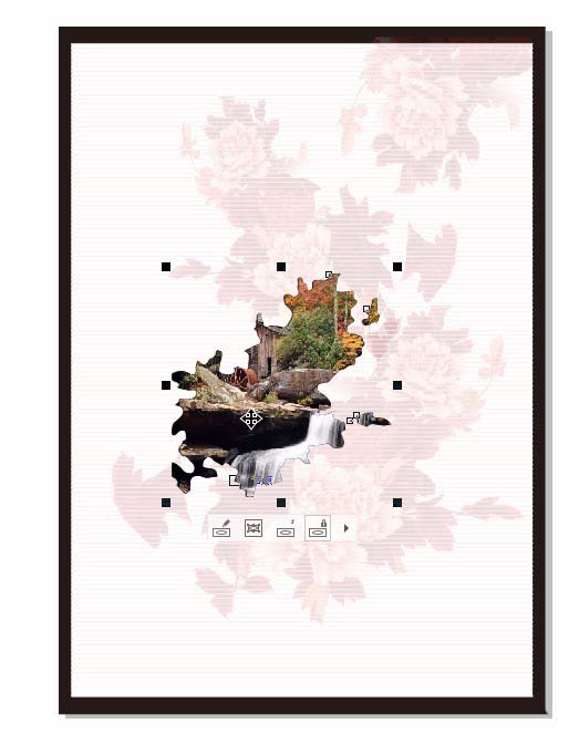 11、置入一张风景图片。将图片置入到上面那张素材图片里。点击 对象-->powerclip-->置于图文框内部;将图案放在矩形框内。点击左下角的编辑图标,并调整好位置。最后选择中间下部的完成编辑的勾图标。