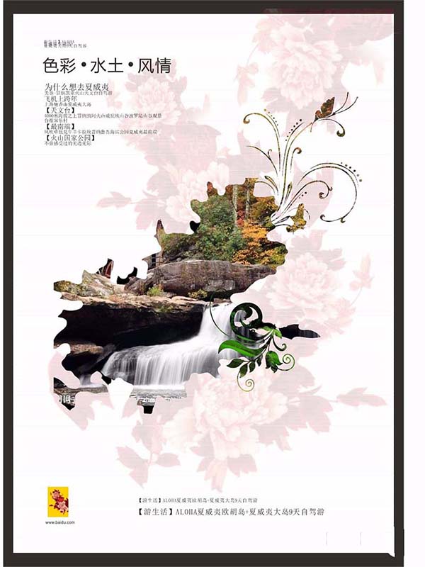 设计旅游广告图需要用到多张当地的风景图,冉舟制作成一个图片,着主要运用“图框精确裁剪”功能来得到特殊的效果。下面我们就来看看详细的制作方法,效果如图。