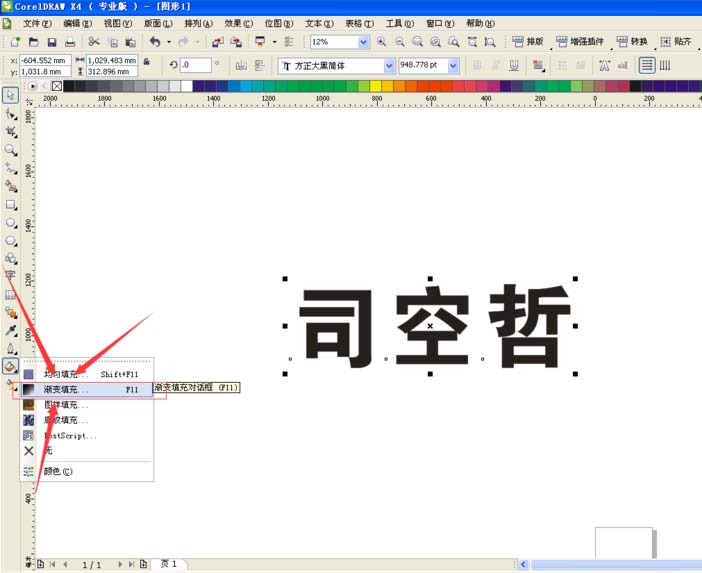 3、选中“司空哲”的三个字,打开工具栏中的颜色填充再选择渐变填充。