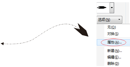 ▪ 箭头:适用于断开的曲线或直接绘制的线条。左侧箭头控制的是曲线的开始,右侧箭头控制的是曲线的结束。点开右边的黑色三角可以选择任意的箭头形状,底下的选项按钮中的属性选项可以针对此箭头做一些设置,比如,大小、镜像、偏移、旋转。