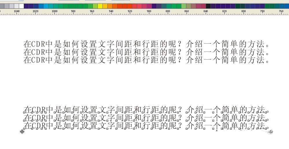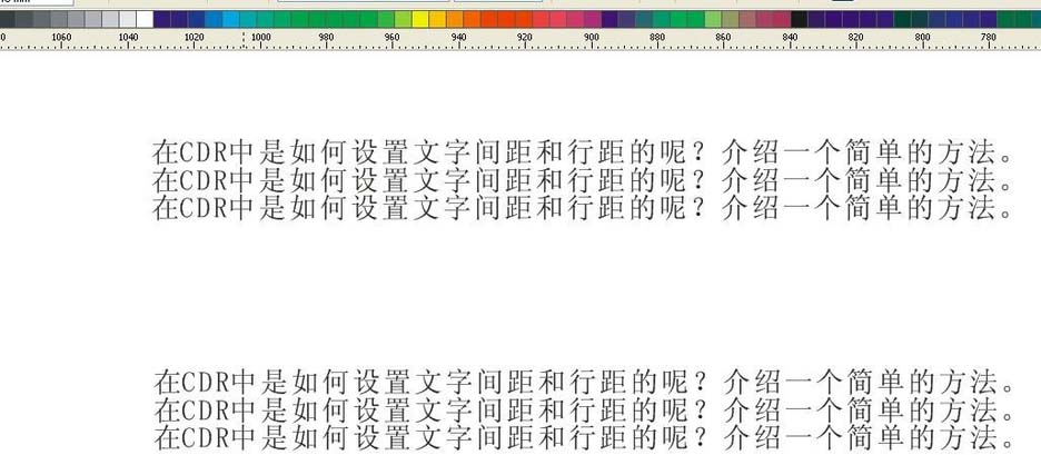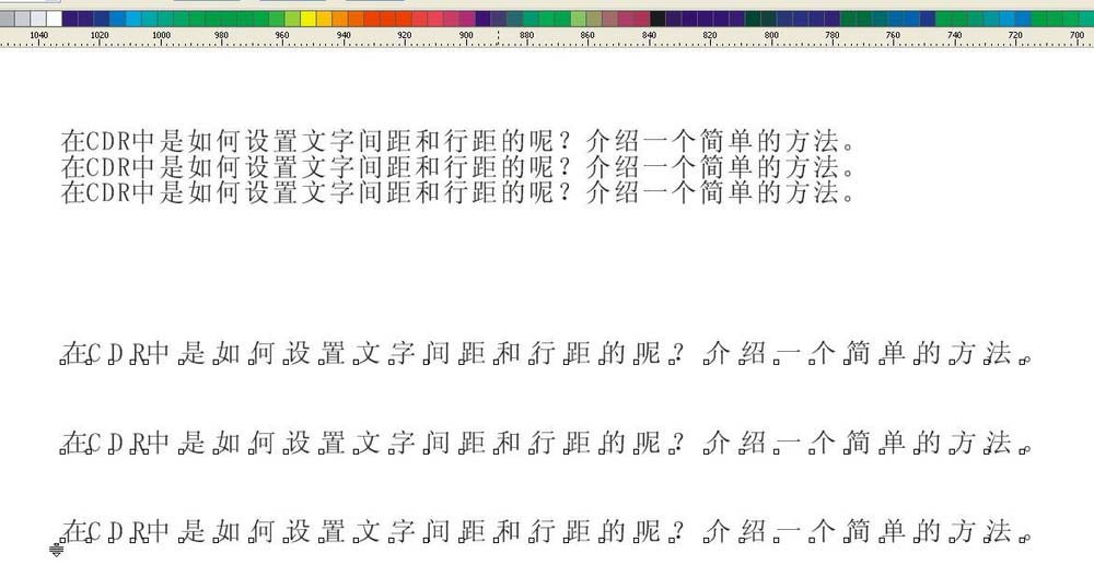 2、用文本工具输入几段文字,用来举个例子,比如输入这一段文字:“在CDR中是如何设置文字间距和行距的呢?”介绍一个简单的方法。“这里弄两段文字,用来两段文字设置前后的对比。