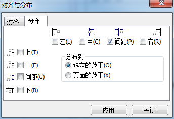 3、点击分布,选择选定的范围,水平间距分布(如图)-应用-关闭