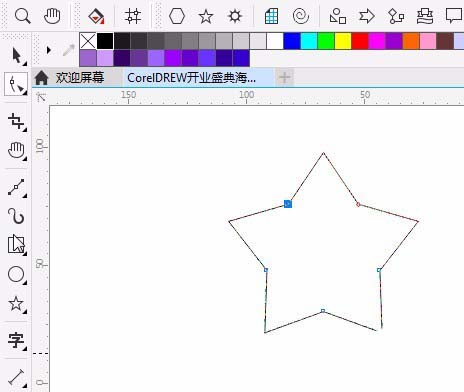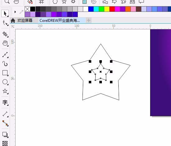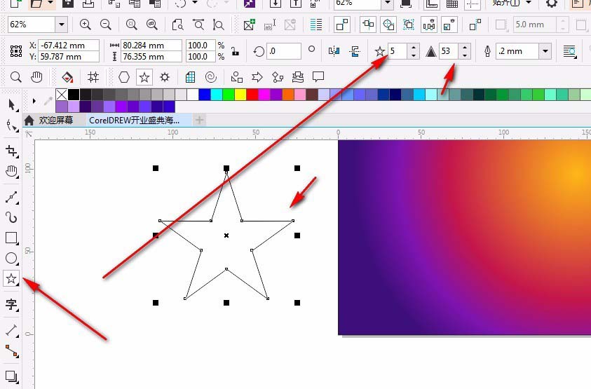 4、选择星星工具,在页面中拉出一个星星,属性栏输入边数5,锐度53,效果如图。 用形状工具拉出想要的效果,如图。